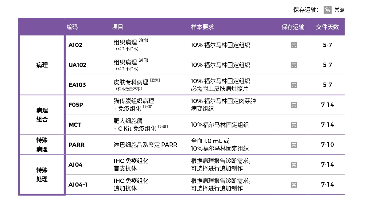 组织病理检测项目表