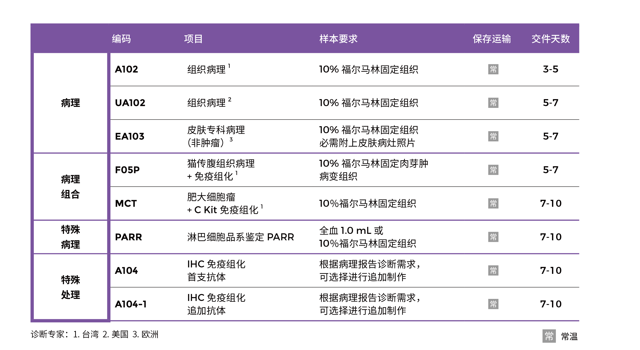 组织病理学检测项目表